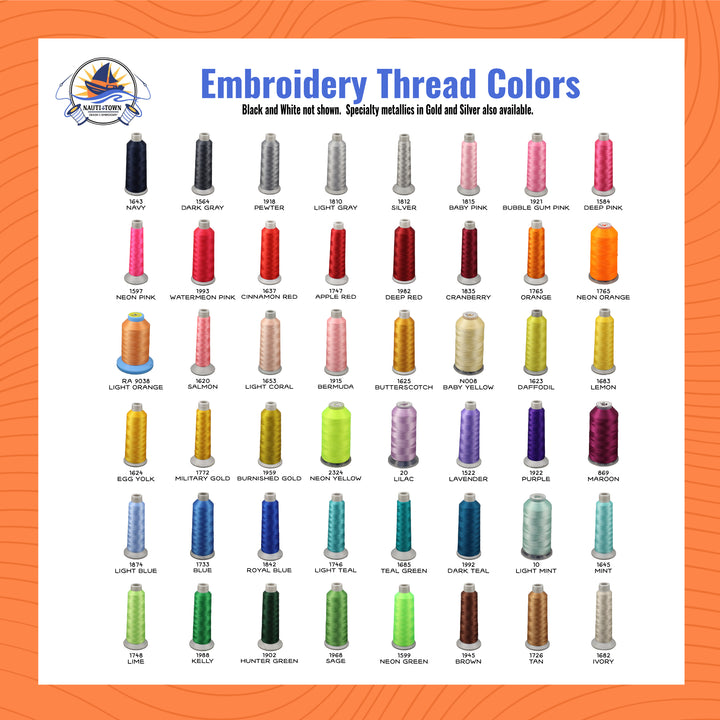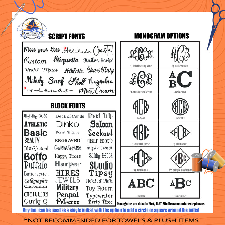 Font spacing may be adjusted during production for the best results, but this preview will give you a general idea of how your name or monogram will look in each font. Not all monogram fonts are shown here—we’re working on adding more! Please see the option sheet for additional embroidery font choices. Want to see a specific font or color that isn't available here before ordering? Just leave a note for a preview, and we’ll email you a sample embroidery design. This preview will be a digital image, not shown on the product itself.